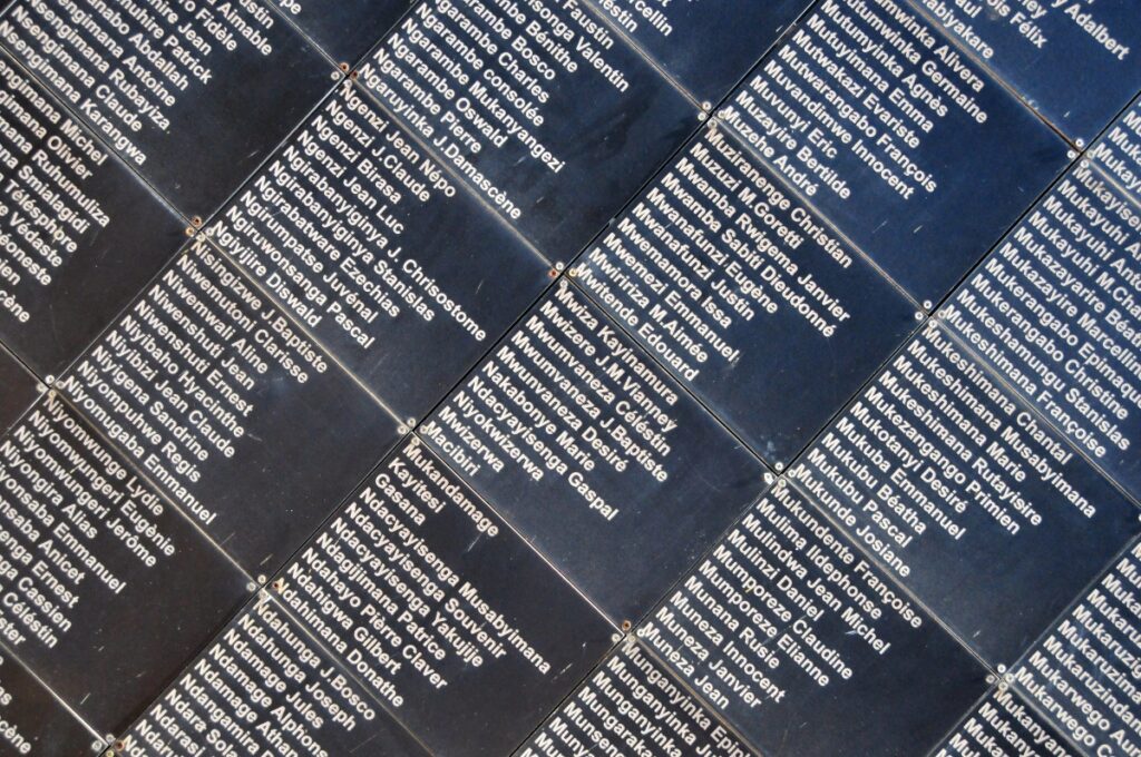 Gisozi, Kigali, Rwanda: Rwandan Genocide memorial names wall – an estimated 500,000 to 1 million Tutsis (70% of the total population) and moderate Hutus were murdered over a 100-day period from April 7 to July 15, 1994. Most of the killings were committed by two Hutu militias, the Interahamwe, and the Impuzamugambi.