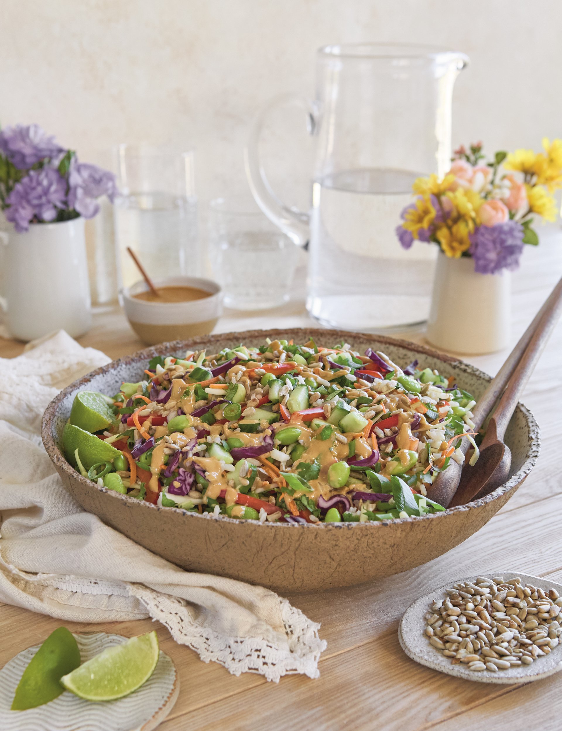 It’s all drizzled liberally with my nutty, gingery, and bright Nut-Free Sunflower, Ginger and Lime Dressing, and sprinkled with crunchy toasted sunflower seeds. We love serving it with Shake-and-Bake Sesame-Crusted Tofu to amp up the protein.