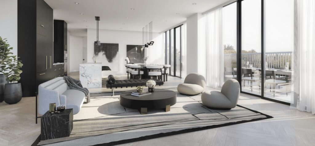 The interior design, a collaboration with internationally acclaimed Ali Budd Interiors, epitomizes her philosophy of “beautifully functional, functionally beautiful.” Budd’s touch is evident in the cohesive design elements, spacious floorplans, and the use of top-tier materials. The residences, ranging from 1,000 to 3,000 square feet, harmonize luxury with livability, offering a versatile canvas for personal expression.